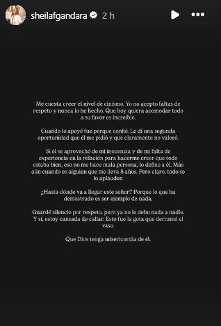 Comentó que ella le dio una segunda oportunidad, después de que él le pidiera que retomaran y que él le demostraría lo importante que ella era en su vida. “Me cuesta creer el nivel de cinismo. Yo no acepto faltas de respeto y nunca lo he hecho. Que hoy quiera acomodar todo a su favor es increíble. Cuando lo apoyé fue porque confié. Le di una segunda oportunidad que él me pidió y que claramente no valoró”.