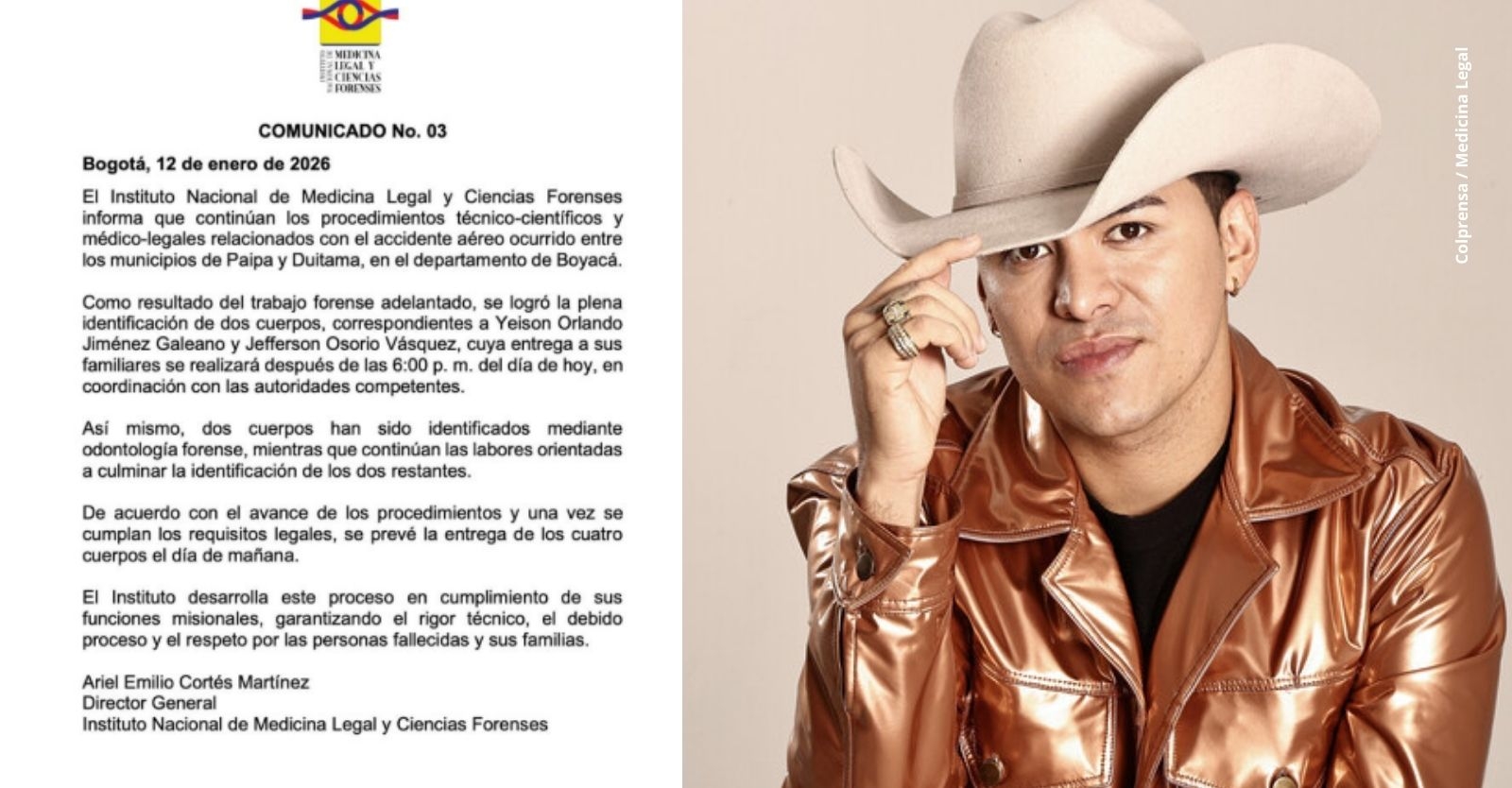 Tras dos días del trágico accidente aéreo que enluta a Colombia, en el que el cantante de música popular Yeison Jiménez perdió la vida junto a su equipo de trabajo, las autoridades entregaron información detallada sobre la identificación de las víctimas. Según informó este 12 de enero el Instituto Nacional de Medicina Legal y Ciencias Forenses, los procedimientos técnico-científicos y médico-legales continúan avanzando para garantizar la correcta entrega de los cuerpos a sus familias.